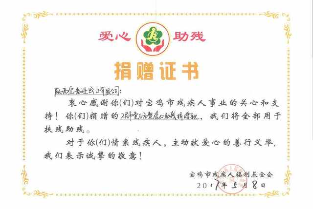 近日,寶雞市殘疾人福利基金會工作人員專程前來,為寶光進出口公司送來了“愛心助殘捐贈證書”,并代表基金會感謝進出口公司的捐贈行為。
