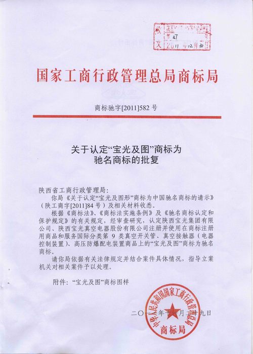 被中華人民共和國國家工商行政管理總局商標(biāo)局認(rèn)定為“中國馳名商標(biāo)”,于2011年11月29日正式下發(fā)了《關(guān)于認(rèn)定“寶光及圖”商標(biāo)為馳名商標(biāo)的批復(fù)》(商標(biāo)馳字【2011】582號)文件)。