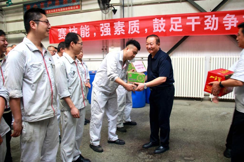 為關(guān)愛(ài)奮戰(zhàn)在高溫一線的勞動(dòng)者,切實(shí)做好夏季防暑降溫工作,7月27日,陜西省總工會(huì)黨組成員、副主席、陜西省國(guó)防工會(huì)主席吳志毅帶隊(duì)到我公司開(kāi)展“送清涼”慰問(wèn)活動(dòng)。寶光集團(tuán)黨委副書(shū)記、寶光股份黨委書(shū)記、總經(jīng)理謝洪濤,工會(huì)主席付宗喜陪同。