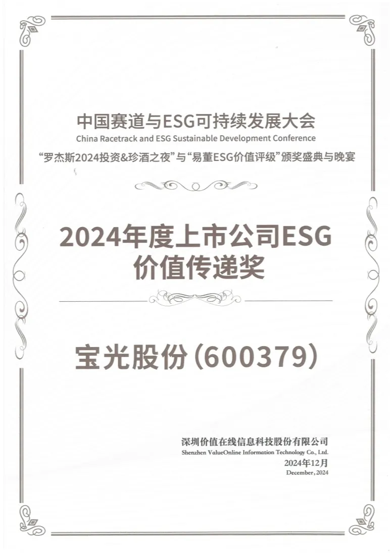 12月8日,易董價值在線ESG價值評級頒獎盛典在深圳舉行,寶光股份憑借在ESG方面的突出表現(xiàn),堅持透明、負責(zé)任的ESG實踐及有效的價值傳遞,榮獲“2024年度上市公司ESG價值傳遞獎”。該獎項的獲得是對寶光股份在ESG信息披露、投資者關(guān)系管理和市場溝通等方面的認可。