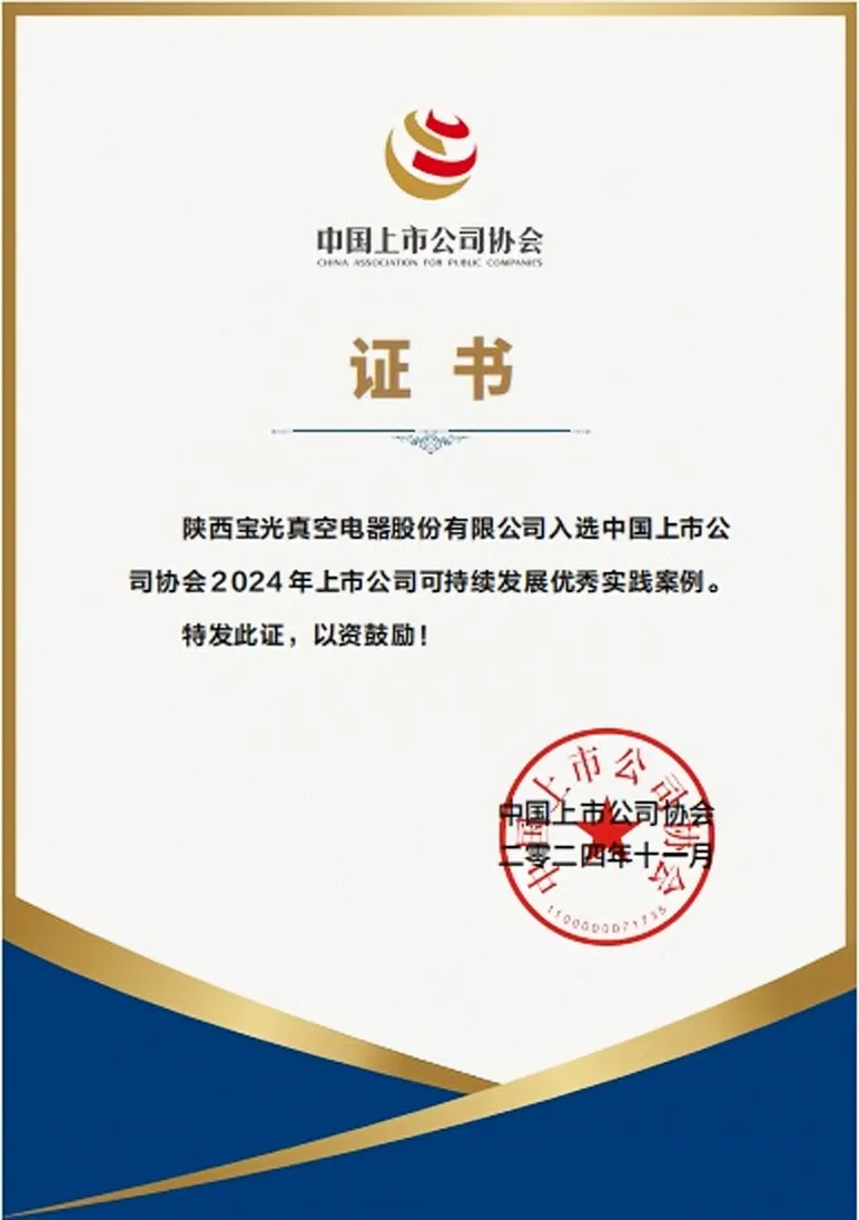 11月26日,中國上市公司協(xié)會發(fā)布“2024年上市公司可持續(xù)發(fā)展最佳及優(yōu)秀實踐案例”名單,寶光股份憑借在推動生態(tài)文明建設(shè)、履行社會責(zé)任、完善可持續(xù)治理體系等方面的優(yōu)秀做法,從596篇投稿案例中脫穎而出,成功入選“2024年上市公司可持續(xù)發(fā)展優(yōu)秀實踐案例名單”。這是公司繼2023年入選中國上市公司協(xié)會“上市公司ESG優(yōu)秀實踐案例”后,在可持續(xù)發(fā)展方面獲取的又一殊榮。這不僅是對寶光股份在可持續(xù)發(fā)展領(lǐng)域所做努力的認可,也是對未來發(fā)展?jié)摿Φ目隙ā?/span>