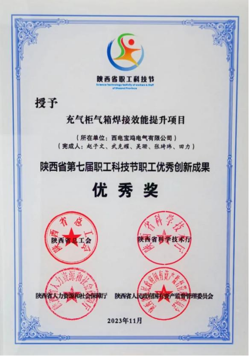 陜西省職工優(yōu)秀創(chuàng)新成果優(yōu)秀獎(jiǎng)——西電寶雞電氣“充氣柜氣箱焊接效能提升項(xiàng)目”