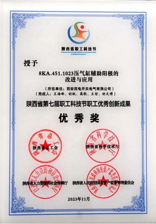 陜西省職工優(yōu)秀創(chuàng)新成果優(yōu)秀獎(jiǎng)——西開(kāi)電氣“8KA.451.1023壓氣缸輔助陽(yáng)極的改進(jìn)與應(yīng)用”