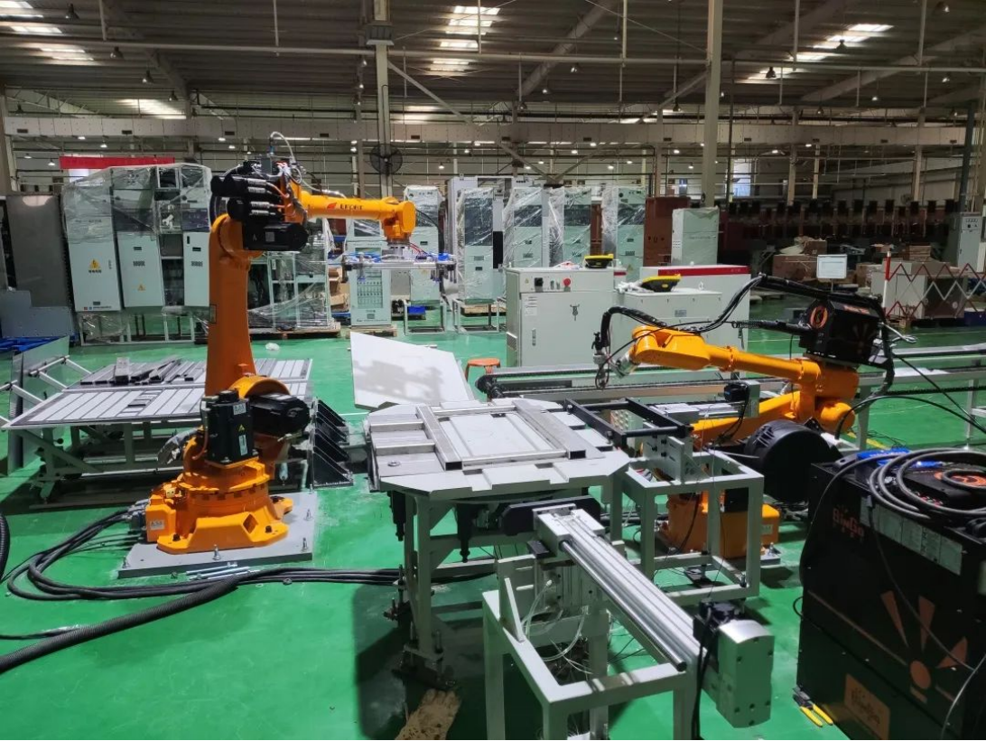 充氣柜焊接項(xiàng)目是在充氣柜氣箱單件筋板焊接時(shí)采用搬運(yùn)機(jī)器人和焊接機(jī)器人相互配合作業(yè),將人工手工作業(yè)模式轉(zhuǎn)向自動(dòng)化方向。項(xiàng)目實(shí)施后,單面箱體筋板從手工焊接2.5小時(shí)縮短至自動(dòng)化焊接1.5小時(shí),同時(shí)有效提升焊縫的一致性,整體提升了焊接的外觀與質(zhì)量。