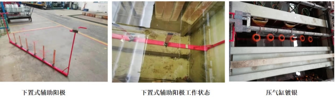 針對(duì)原輔助陽(yáng)極的不足制定改善措施,利用車間閑置的不銹鋼材料焊接制作成一個(gè)新結(jié)構(gòu)的輔助陽(yáng)極,新輔助陽(yáng)極整體布置在鍍槽底部,可以?shī)A裝6塊銅板、銀板,鍍銅、鍍銀過(guò)程中通過(guò)輔助陽(yáng)極上銅板、銀板的電解,并及時(shí)補(bǔ)充壓氣缸內(nèi)腔溶液中消耗的銅離子、銀離子,保證了壓氣缸內(nèi)腔電鍍?nèi)芤撼煞值姆€(wěn)定。經(jīng)過(guò)近一個(gè)月的生產(chǎn)驗(yàn)證,采用新結(jié)構(gòu)的輔助陽(yáng)極生產(chǎn)的壓氣缸內(nèi)腔鍍層外觀良好,無(wú)發(fā)黑、起黑點(diǎn)等問(wèn)題,零件熱震無(wú)起泡,滿足了百萬(wàn)伏零件質(zhì)量要求。