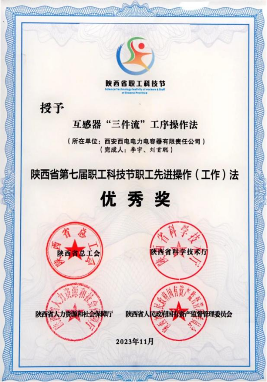 陜西省職工先進(jìn)操作(工作)法優(yōu)秀獎(jiǎng)——西電西容“互感器'三件流'工序操作法”