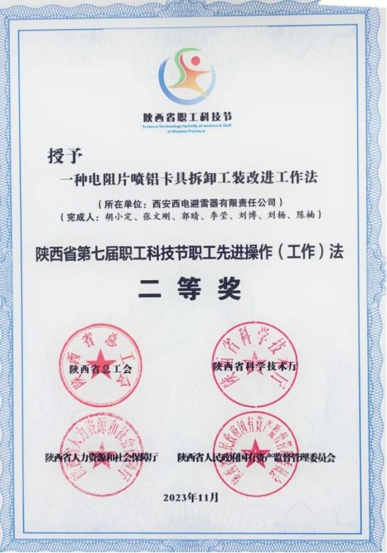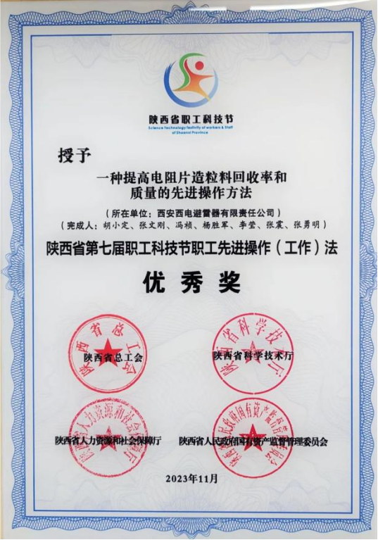 陜西省職工先進(jìn)操作(工作)法優(yōu)秀獎(jiǎng)——西電避雷器“一種提高電阻片造粒料回收率和質(zhì)量的先進(jìn)操作方法”
