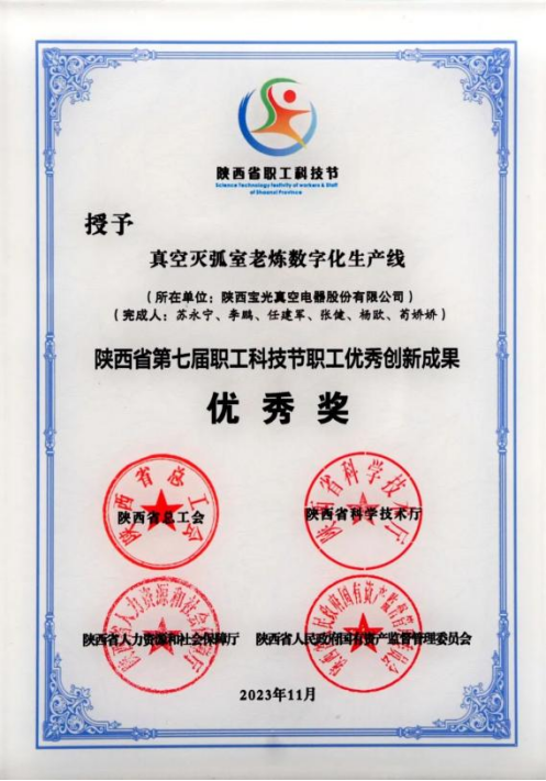 陜西省職工優(yōu)秀創(chuàng)新成果優(yōu)秀獎(jiǎng)——寶光股份 “真空滅弧室老煉數(shù)字化生產(chǎn)線”